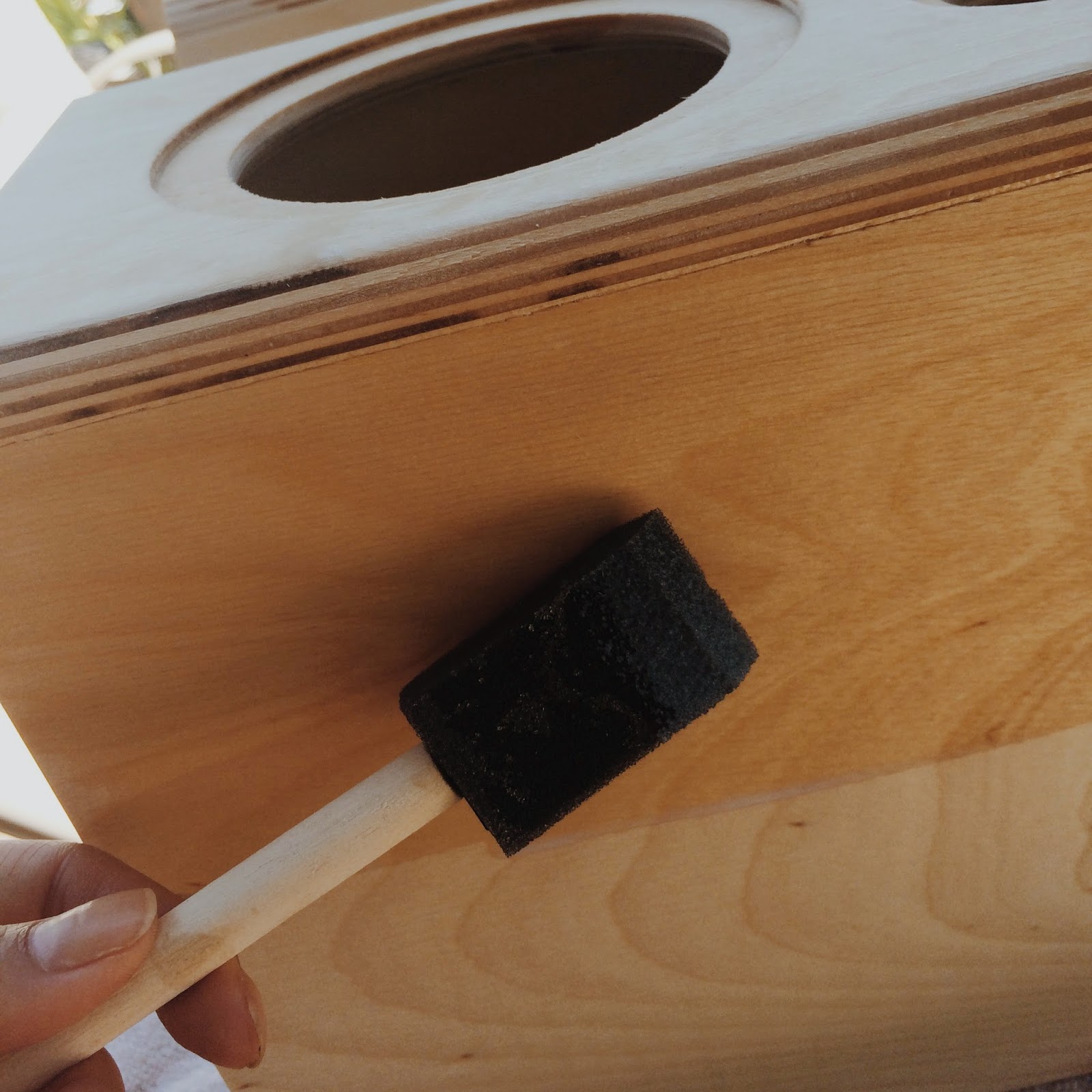 First, the wood conditioner! It's a milky-looking liquid that darkens the wood slightly. What it is actually doing is filling in the tiny gaps between the wood grains, so that the stain will apply evenly.
