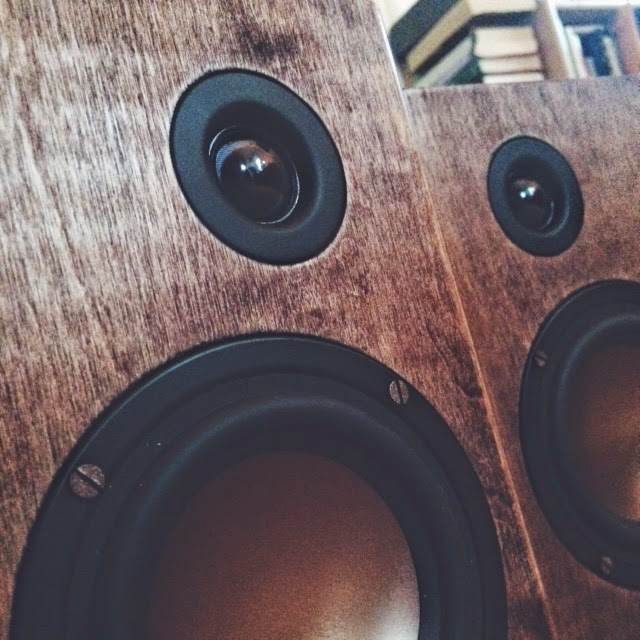 This is what my speaker pair looks like when completed! I am really happy with how they turned out :) The bronze colored basses really go with the wood color, as well as the screws.